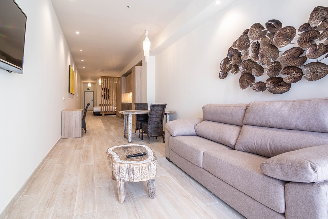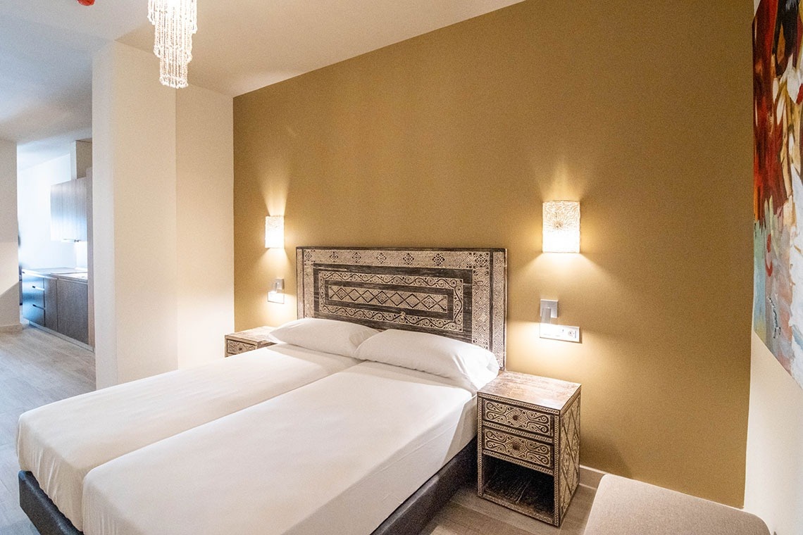 Estudios superiores de 70 m2 con gran amplitud, cuentan con terraza, están preparados para el alojamiento de dos personas, disponen de salón-dormitorio con cocina integrada y baño independiente. Están equipados con cama doble de 180 cm (con opción de separar en dos camas de 90 cm), televisor de pantalla plana, armario-ropero, cocina americana equipada con horno-microondas, placa de inducción, nevera, lavadora y todo el menaje necesario para la preparación y consumo de alimentos.